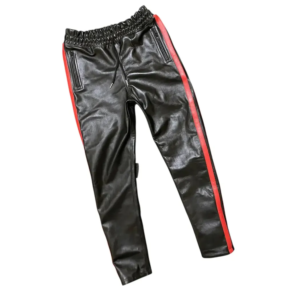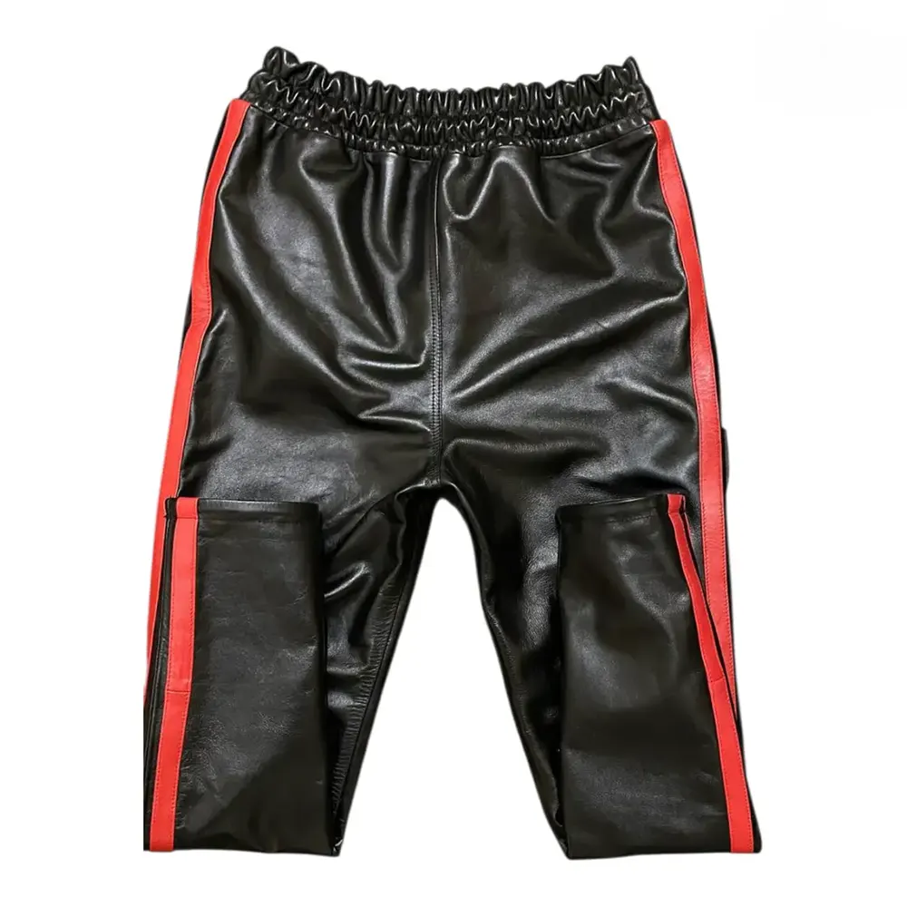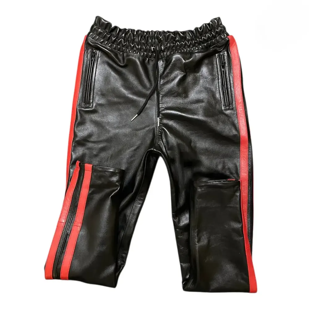 This bold red-and-black set features a short sleeve command-style leather shirt paired with black leather pants detailed with red racing stripes. The contrast stitching and structured seam lines create a clean, powerful silhouette that stands out in any setting.
