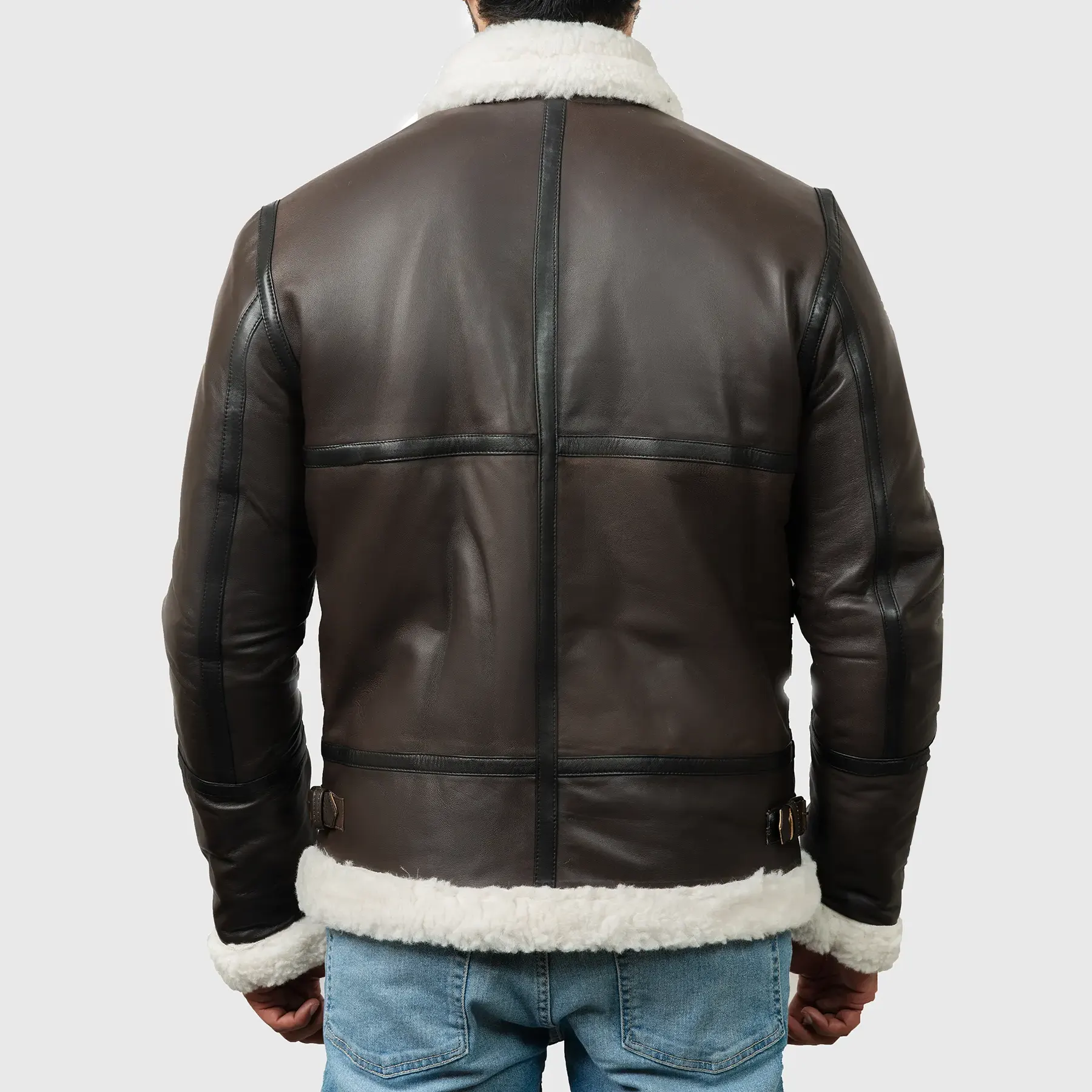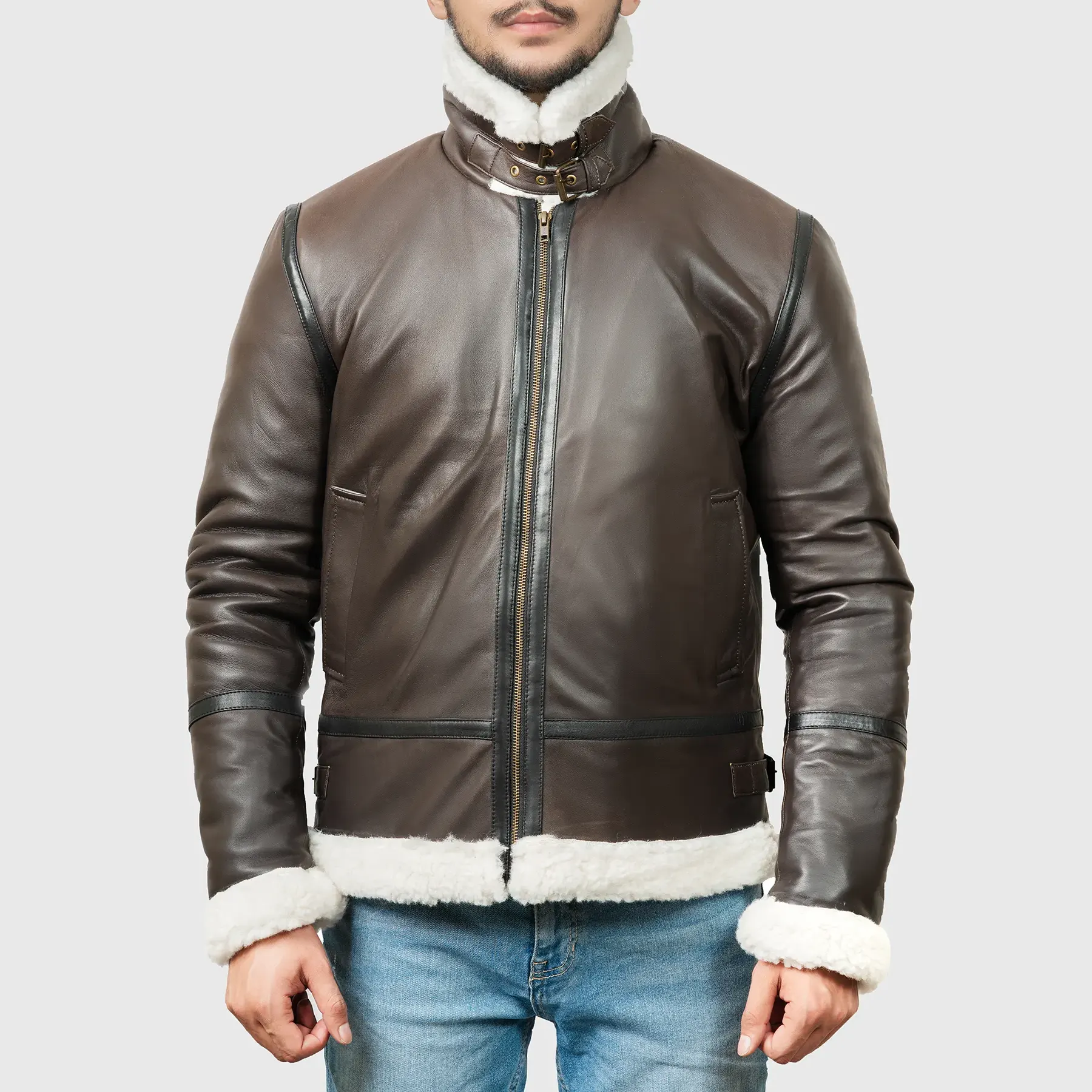 Men’s Dark Brown B6 Shearling Leather Jacket with Stand Collar